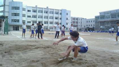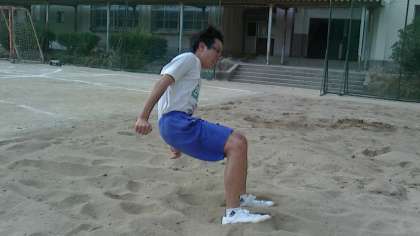 自分たちで掘り返した、ふかふかの砂場がここで効果を発揮する。柔らかな砂場が着地を受け止めてくれる。怖がることもなく思いっきって前傾姿勢で飛び込めました。