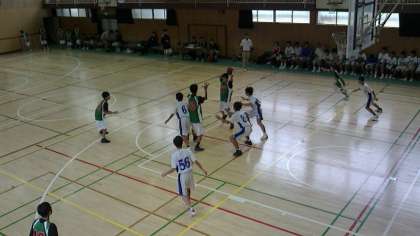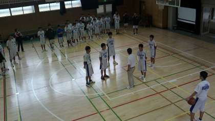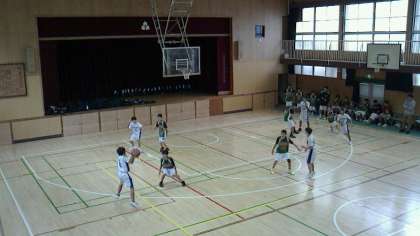体育館では男子バスケット部が、他の中学校チームを招いての練習試合を行っていました。練習試合では、たくさんの生徒に出場機会を与えながらのチーム編成で臨んでいました。生徒達は顧問の先生に、試合の場面をリアルタイムに検証しながら指導を受けていました。