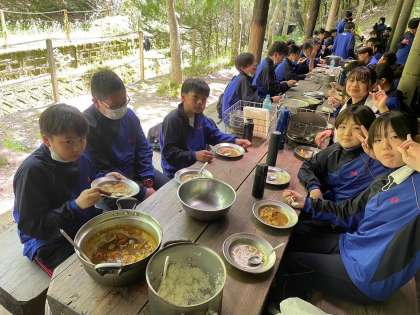 薪しばで火をつくり、野菜や肉を切ってカレー、お米を炊きました。水の分量など苦戦しながらもみんなで作った特別なカレーライスが完成しました。