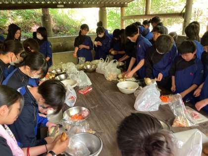 宿舎を出発し、炊飯場にて各クラスごとにカレー作りを行いました。