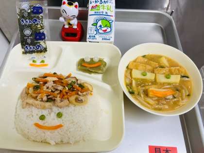 鶏肉、ちくわ、にんじん、さんど豆を煮込んだ彩のよい具材を混ぜ、喫食時にきざみのりをかけて風味を添えたものです。