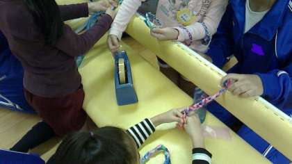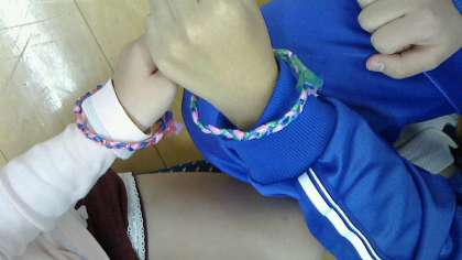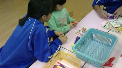 多色のPPロープを編んでミサンガをつくり、手首のまいてもらっています。また他のテーブルでは折り紙を教えてもらっている園児もいました。
