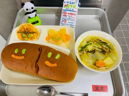 ツナ、コーン、ピーマン、チーズをピザソースで和え、餃子の皮に乗せて焼きました(約800枚近く!)。ピザ生地は焼くのに時間がかかり、給食として提供できないものでしたが、なんとかならないかと工夫し、餃子の皮を使うことで1人1枚が実現しました。人気献立で、焼く時間が5分と短いので、お家でもチャレンジしてみてはいかがでしょうか。