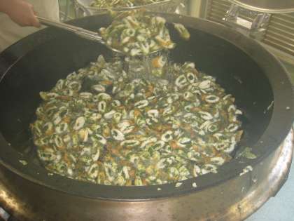 1個のちくわを4等分し、青のりを加えた衣をつけて約3000切を揚げました。