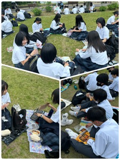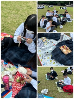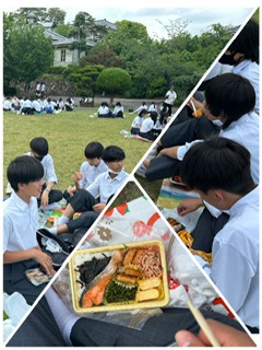明治村に着いたので、写真撮影後、広場でご飯を食べました。皆さん普段は給食なので、お弁当は新鮮だったようで、写真を撮っていた人もいました。朝早くからお弁当を作ってくれた保護者の方に感謝して、美味しく食べていました。