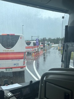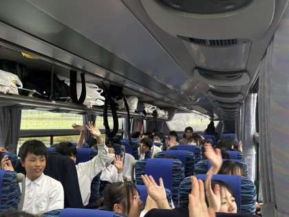 昼食、お土産購入を済ませたので、13時半ごろに牧歌の里を出発しました。生徒たちは牧歌の里でお世話になった人達に手を振っていました。