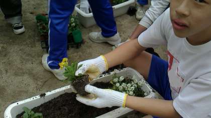 プランターの土を耕して柔らかくしてから、やや深めの植穴をつくります。ポット苗は容器ごと柔らかくもみほぐして、根が張りやすくしました。