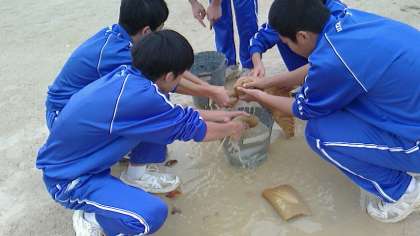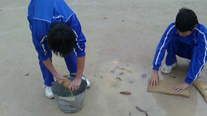 テニス部員は体育大会早朝時のように、バケツを持ちスポンジで雨水を吸い取り始めました。