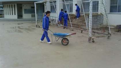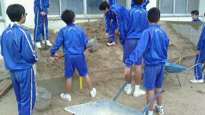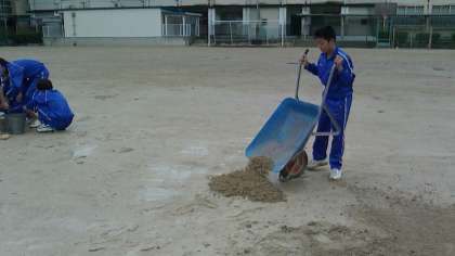 あるものはスコップで土を取り、またあるものは一輪車で土を運んでいます。