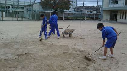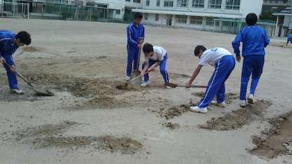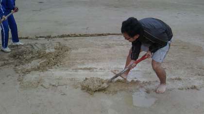 雨で気持ちやわらかくなっているを見計らっての作業とはいえ、スコップで広範囲削り取るのはかなりの重労働です。顧問の寺井先生は素足で力が入っていました。
