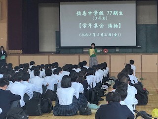 野尻先生からは勉強することの大切さについて、お話されました。3年生最大の行事である修学旅行が終わって、来週は実力テストがあります。しっかり勉強する体勢に入っていきましょう。