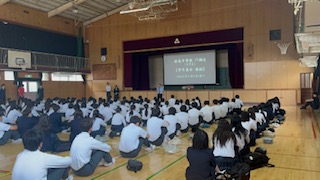 本日の3年生の学年集会は、まず初めに松本先生から修学旅行の新聞についての説明がありました。修学旅行の新聞は班でテーマを決めて作成します。皆さんで協力して、見やすい、分かりやすい新聞を作ってください。
