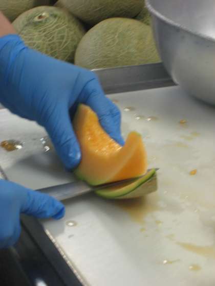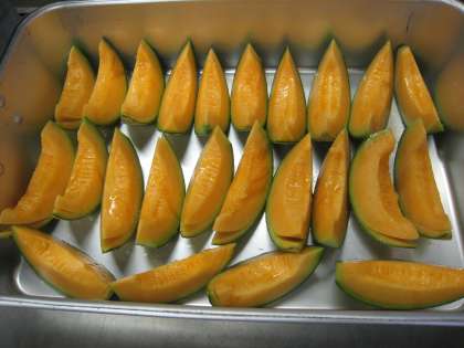 1個1kg大のクインシーメロンを1/8に切り、種を取り除いたあとに皮と実の間に切り目を半分くらい入れて(なんと4人がかりで70分かけて!)、食べやすい状態にしていただきました。ありがとうございました!