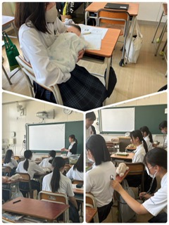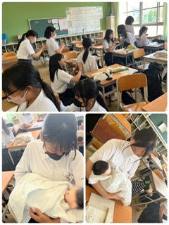 宣真高校の看護コースの授業です。実際の聴診器を使って心臓の音を聞いたり、赤ちゃんの人形を抱っこして、赤ちゃんの重さを感じたりする授業でした。