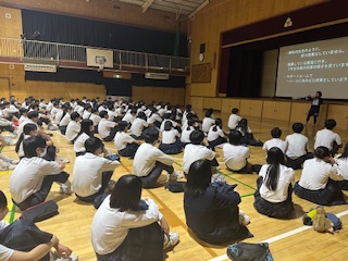 3年生は、本日の6時間目に特別支援理解教育を行いました。本校の支援学級(歌島中ではサポートルーム)の堤先生が学年の生徒に向けて行っている取り組みです。毎年行っていますが、今年は3年生ということもあり、社会に出た時に支援が必要な人とどのように接していくべきなのか、またその人たちがどのような支援が必要なのかしっかり考えてほしいというお話でした。生徒たちはとても真剣に聞いていました。