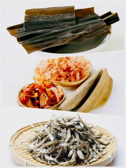 給食の和風献立のだしは、だしこんぶ、けずりぶし、煮干しからとっただしを使用しています。だしこんぶのうま味は、グルタミン酸です。けずりぶしと煮干しのうま味は、イノシン酸です。