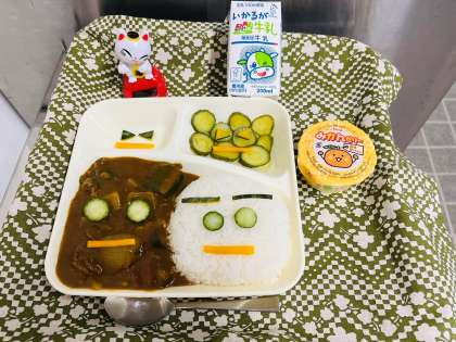 夏野菜のカレーライスに使用している野菜は、かぼちゃ(長崎県産42kg 20個)なす(奈良県産24.3kg 174個)ピーマン(宮崎県産6.3kg 177個)トマト(缶 10kg)の4種類です。カレーライスにいつも入っているじゃがいもが使用されていない特徴のあるカレーライスで人気があります。