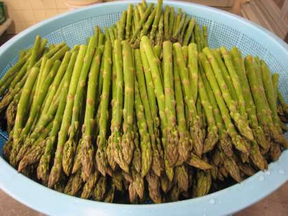 季節の新鮮なグリーンアスパラガス(生産量2位の熊本県産26kg約1,300本)が届きました。グリーンアスパラガスとキャベツを蒸し、砂糖・塩・ワインビネガー・綿実油で作ったドレッシングであえました。