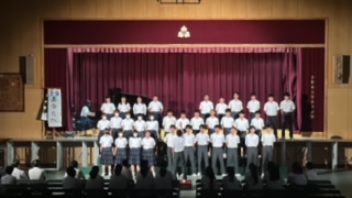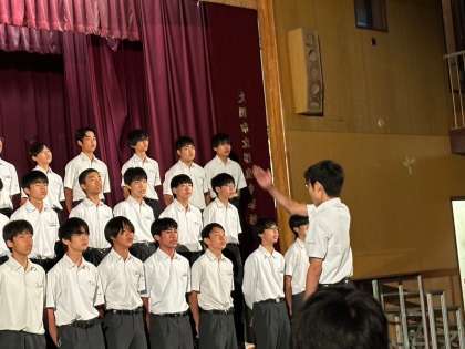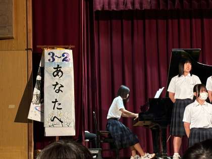 2番目は2組の番で、合唱曲「あなたへ」です。この曲は今年の卒業式でも歌われた曲で、感情がのせやすく、歌いやすい曲です。2組の皆さんは見事に歌っていました。