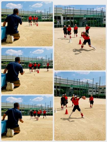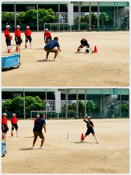 ショートステップでの捕球から送球への連係動作の練習です。