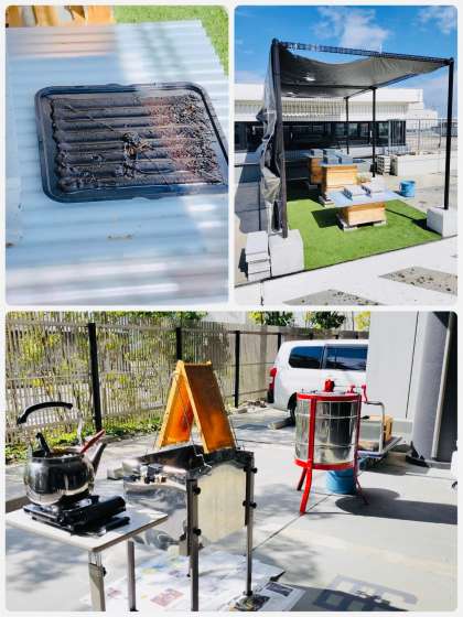 スズメバチがミツバチを食べてしまうそうで、スズメバチを捕まえる罠も見せていただきました。(写真の黒いプレート)
