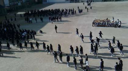 避難を終了して園児・生徒は、グランドに降り整列しました。