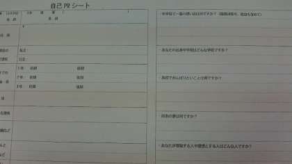 自己PRシートには、自分の長所や中学校での思い出、高校に進学して頑張りたいこと、自分の夢など高校入試面接時を想定して作成しました。3年生徒にとって入学試験は身近な時期となり、真剣に取組んでいました。