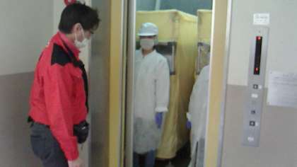 クラスごとのワゴンをエレベーターで3・4階に運びます。