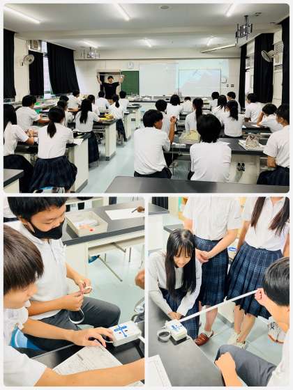 記録タイマーを使って0.1秒間に打点される点の数を数えることと、テープの長さからcm/秒を導き出すという実験をしました。色々なテープの長さが表れ、教室は少し笑いも起きながらの授業でした。