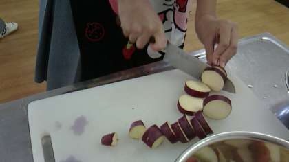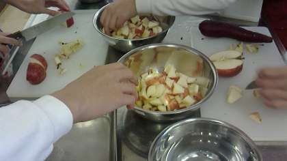 リンゴとサツマイモを一口サイズのさいの目に切ります。
