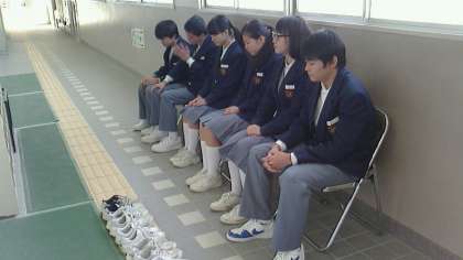 ミーティング室前の廊下では、緊張した面持ちで身なりをただし、静かに待てていました。前のグループの靴がきれいに並んでいます。