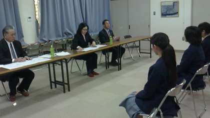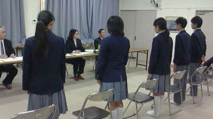 校長面接はミーティング室で行う集団面接です。面接官に好文学園高等学校から先生をお迎えしての面接です。好文学園高等学校の先生は、入学試験のときに実際の面接を担当される先生方です。歌島中学校の校長先生とともに面接をしていただきます。