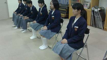姿勢をただしています。手の位置は男子は両手を軽く握り膝の上においています。女子は両手を重ねて膝の中央に置いています。