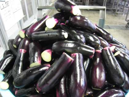 なすは、夏から秋が旬で、給食では7月から10月に使用しています。今日の「なすのミートグラタン」が今シーズン最後のなす(山梨県産26.8kg、約260個)です。