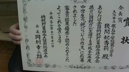全国納税貯蓄組合連合会並びに国税庁共催の、中学生の「税についての作文」において、4名の3年生が入賞しました。