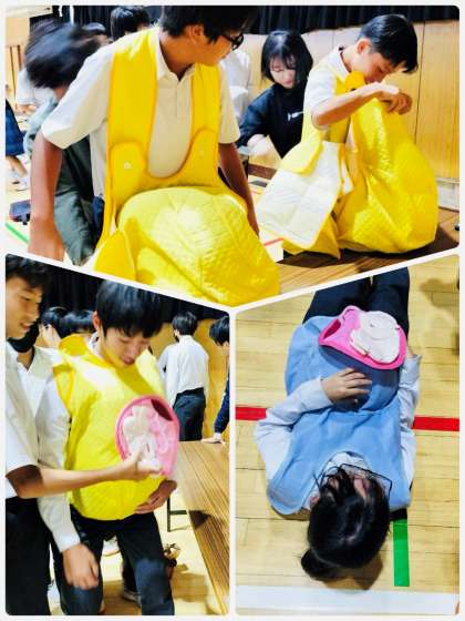 後半は妊婦さん体験、赤ちゃん人形抱っこ体験、赤ちゃん親子さんとのふれ合い体験をさせていただきました。妊婦さん体験では6kgのジャケットを着用し、重たい荷物を持ったり普段何気なくしてる動作を実際にしてみたりしました。赤ちゃん人形抱っこ体験では、新生児サイズの人形を抱っこさせていただきました。