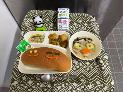 鶏肉(皮なしもも肉、皮なしむね肉50%ずつ)48.4kgに塩、粗挽(あらびき)こしょう。ガーリック、カレー粉で下味をつけ、スチームコンベクションオーブンで焼きました。香辛料がよく効いた仕上がりで香りがよく、食べる前から食欲が刺激される献立で大好評でした。
