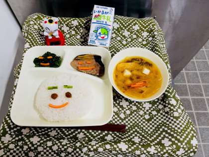なまりぶし(1切40g)をせん切りにしたしょうがと共に砂糖、みりん、しょうゆ、料理酒で煮た「なまりぶしのしょうが煮」と「なめこのみそ汁」「ほうれんそうのごまあえ」の組み合わせで米飯にとてもよく合う和風献立でした。