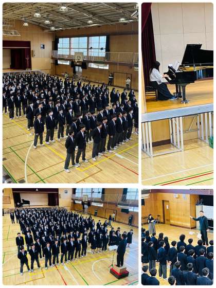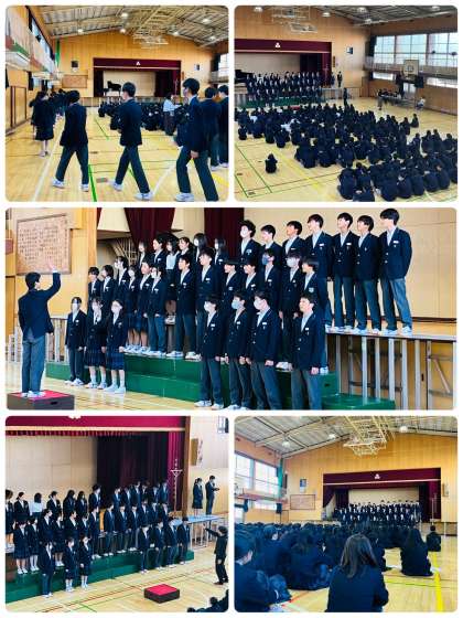 「今日のリハーサルを終えて感じたことを3つ言いますね。まず一つ目、全員合唱は気持ちいいですね。でも、もっと練習が必要だと思ったので私も指揮の練習をもっと頑張って、伴奏者の先生と一緒に本番に臨みたいと思います。2つ目、一生懸命取り組んでいる生徒が多いクラスはいいなと思いました。取り組んでいる最中に笑ったりするのはカッコ悪いと思います。一生懸命なら歌が下手でもいいと思うんです。一生懸命やってる人の姿を見ると清々しく見えるんです。みんなの前で恥ずかしい気持ちもあるんだろうけど、一生懸命やらないのはとてもカッコ悪いし、腹が立ちます。失敗してもヘラヘラ笑っているのは許せないと思うんです。なぜなら、一生懸命やってきたはずなんだから。指揮者や伴奏者、パートリーダーなんかで一生懸命取り組んでくれている人がいるのだから、最低限一生懸命取り組むっていう姿勢は大事だと思います。3つ目、移動のときに駆け足で戻ったり、段から降りるときに音を立てる人がいますが、ゆっくり静かに移動してください。本場前に一生懸命できる人をどれだけ増やせるかを大切にして本番まで頑張ってください。」