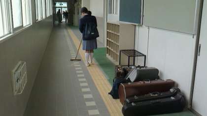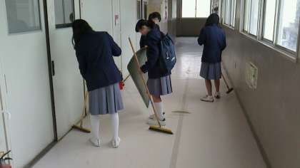 職員室前の廊下を吹奏楽部委員が、ほうきを持っての清掃活動です。