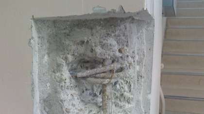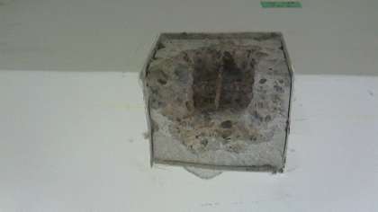 柱や梁は切り抜きはありませんが、コンクリートをはつっていました。鉄筋をむき出しにして腐食の状況を検査していました。建築時期は昭和30年代の建物につき、川砂の時代なのか私が見た限り、腐食も見られず当時の状態が表れているように思いました。