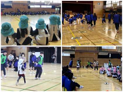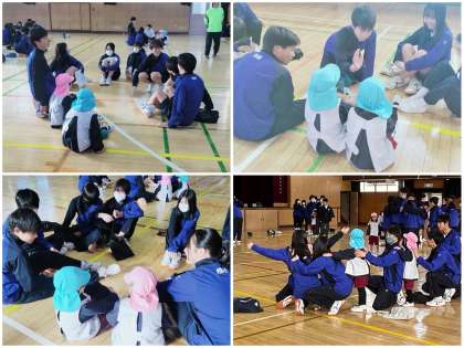 4組、5組、6組では自己紹介のあと、「めくってめくって」をチームに分かれて行いました。最後には中学生代表と園児さんの混合チームでAチーム、Bチームにわかれてリレーを行い、大盛り上がりで終えました。