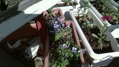 玄関周りのプランターの花が、寒さに耐えて咲いてきています。