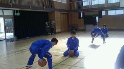 5時間目の体育館での3年男子体育科の授業では、準備運動(体操・ランニング・体幹トレーニング)ののち、バスケットボール競技の授業参観でした。授業の評価として、生徒達はバスケットボールを用いてハンドリングの8の字回しの回数を競いました。