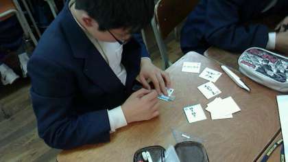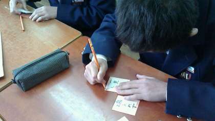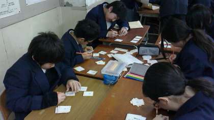 かるたのカードを縁どりしている人、カードに文字を書いている人がいます。班員それぞれがパート部分の作業をこなすことで、一組が完成します。協力なくしてより良いものはできません。