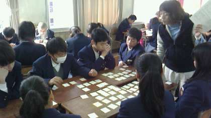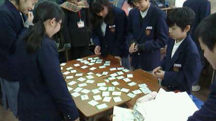 札の並べ方を几帳面に並べている班、覚えにくくするためあえてばらばらに散らかした班、それぞれの思いが反映しています。勝敗を男女対抗形式にしている班もありました。