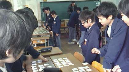 班員が読み手と札の取り手に分かれての練習です。担任の先生が読み手になり、生徒全員が札の取り手として練習しているクラスもありました。