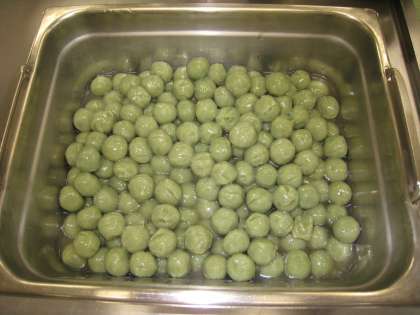 毎年3月に登場する和風デザートの「よもぎだんご」は、うるち米、もち米、よもぎで作られています。本日届いた「よもぎだんご」は、約5,300個(1人約7個)で、蒸した後「蜜(みつ)」をからめ、食べる時に、きな粉をかけていただきました。