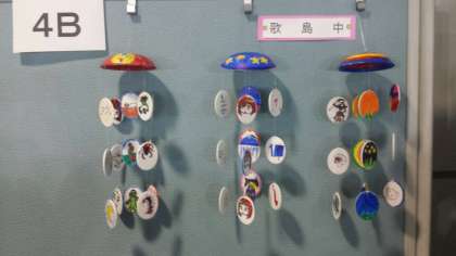 大阪市の特別支援学級・特別支援学校の生徒たちが作った作品を展示しています。歌島中学校の作品は、ゆらゆら風鈴と回転ごまです。