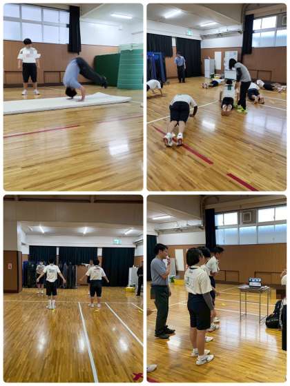 今日はラジオ体操、腕立て、前転を通じて正しく身体を動かすことができているかを確認しました。